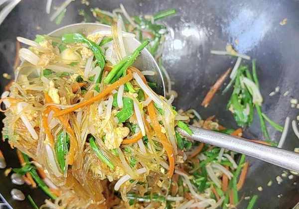 6、把粉絲和雞蛋也一起倒入鍋內,翻炒均勻。粉絲和雞蛋都是熟的,所以不需要炒太久,隻要翻炒均勻即可進入調味的步驟。