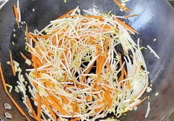 2、綠豆豆芽和胡蘿卜素都很細嫩,所以無需焯水,直接生炒很容易就可以斷生。