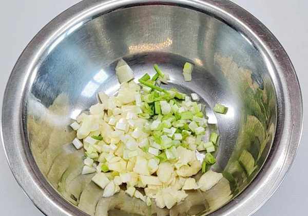 5、蒜子去外皮後先用刀面拍散,然後再切成蒜末,小蔥隻取蔥白,蔥白切成蔥花後備用。這兩樣都是增香的料頭。可別小看這小小的料頭,我們炒出來的合菜,香氣好不好這料頭可是能起到重要的作用。