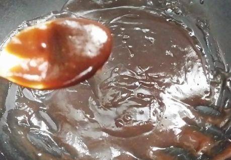 第三步,攪拌均勻,直到剩下我們普通甜面醬的顏色,然後把攪拌好的醬汁倒入鍋中,不用加油,小火煮,過程中要不斷攪拌;
