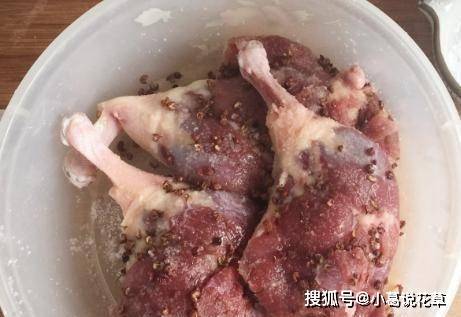 第二步,將鴨腿預洗幹凈,趁熱在鴨腿上撒上炸鹽,用手按摩,然後用塑料佈蓋住鴨腿,放入冰箱冷藏。.醃制一整天;
