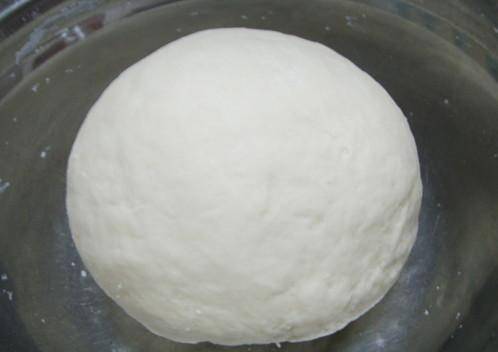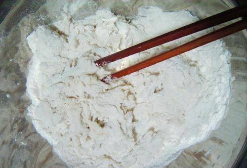300克面粉倒入幹凈的盆裡,加入少量糖和奶粉拌勻(加奶粉可以讓饅頭很白,這是舅舅教的技術),然後加入酵母水,倒入批次,通過澆註混合。加入薄片後,揉成硬度適中的面團。