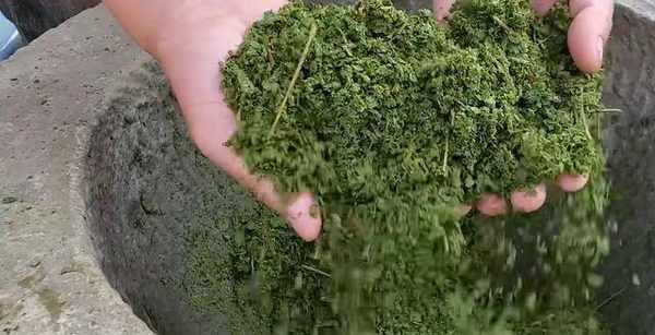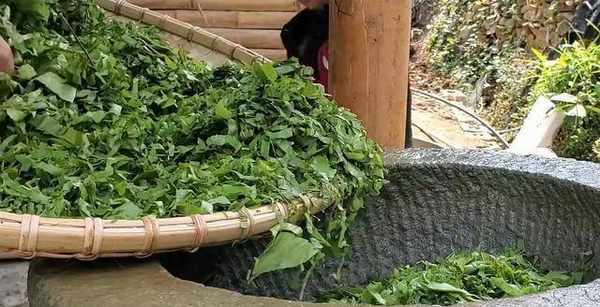 把切碎後的楓樹葉子,放在對窩裡面搗碎。