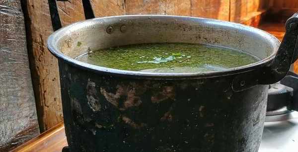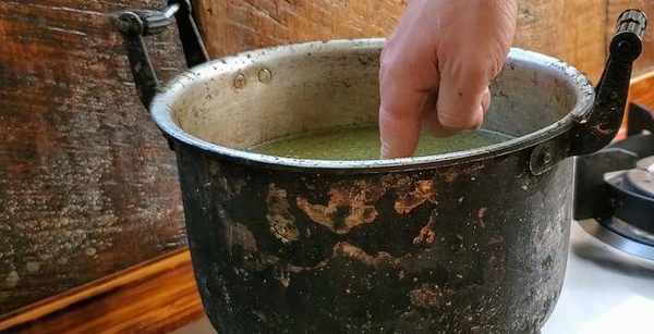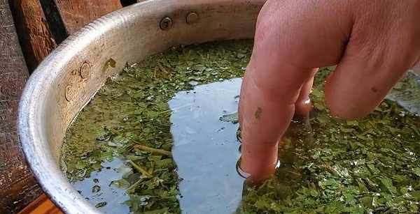把搗碎後的楓樹葉子倒入鍋內煮一下,但是要控制好溫度。