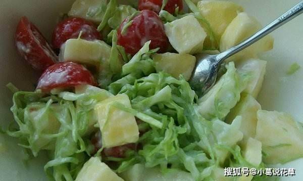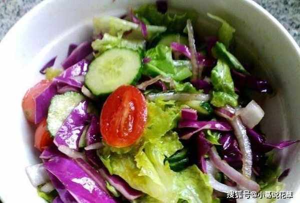 紫甘藍洗凈切成小塊,黃瓜洗凈切片,放入碗中,準備一個檸檬,對半切開,在碗中擠些檸檬汁,剩下的檸檬切一兩片。碗中加入少許橄欖油和沙拉醬,攪拌均勻即可食用。它營養豐富,口感細膩,非常可口。