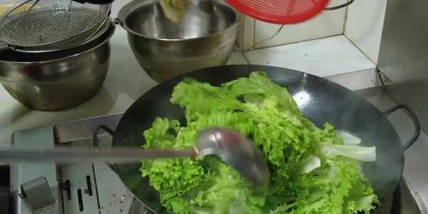 油溫燒至八成熱時,澆在生菜上炸出蔥蒜的香味,最後再放入青紅椒絲點綴一下。