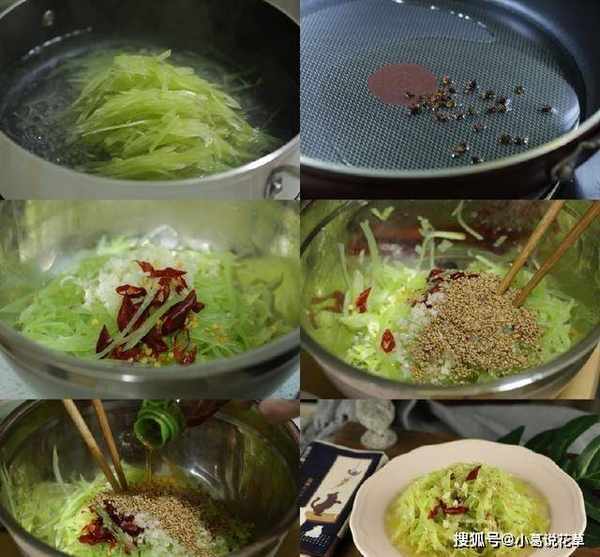 生菜切絲後,放入沸水中煮熟,取出並在水龍頭下沖洗至冷卻。同時在鍋裡放一勺植物油,放入十幾粒花椒,十秒後關火,將花椒丟掉,隻留下香噴噴的花椒油。將生菜絲、幹辣椒碎、蒜末、白芝麻、一勺生抽、一勺鹽放入鍋中,最後“啪”的一聲倒入花椒油。攪拌均勻,就成瞭一道香噴噴的涼拌沙拉。