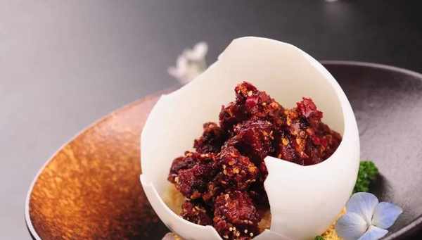 3.鍋放油,下薑略炒,再放入牛肉丁,摻適量清水,調糖醋口味後,用小火收汁,撒入辣椒面、花椒面翻炒均勻,起鍋晾涼,裝在盤中“蛋殼”內,造好型即成。