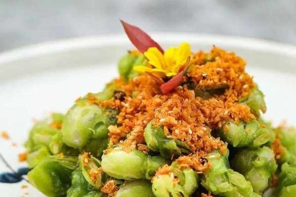 將百合裹上綠色脆皮糊,鎖住百合原有的水分和營養,與避風塘料結合,搭配新穎,成菜口味香脆,是一道下酒佳肴。