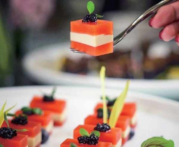 4.走菜時,取出凍好的番茄鵝肝切成大小均勻的塊,擺盤中,在每一塊上舀上魚子醬,稍加點綴即成。