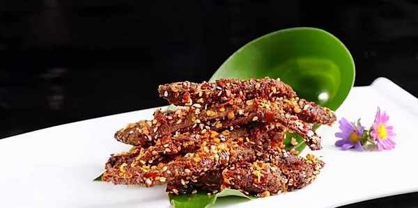 2.鍋留底油,先下刀口辣椒、十三香和鹽炒香,再放入炸好的泥鰍翻炒勻,加熟芝麻和味精炒幾下,出鍋晾冷便可裝盤上桌。