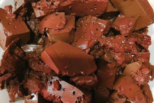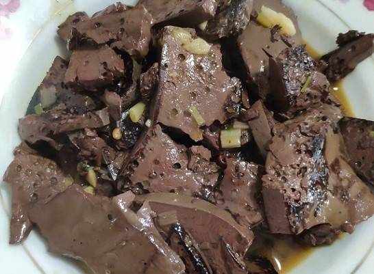 起鍋,先在炒鍋裡加入適量的油,油溫達到要求時,先把蒜和薑放入鍋中,然後放入豬血,快速爆香後,放入蔥段起鍋,加入適量鹽,雞精少許,翻炒幾下即可出鍋。