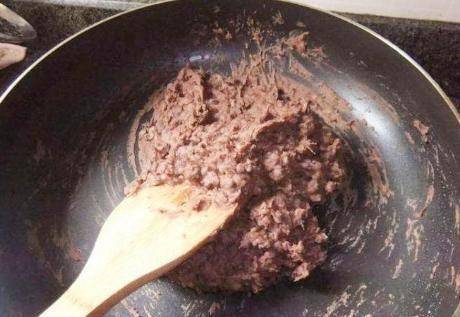 第三步,將紅豆煮軟。將豆瓣醬放入鍋中,開始煎。加入混合好的玉米油翻炒,攪拌均勻,讓豆瓣醬和玉米油完全融合。;