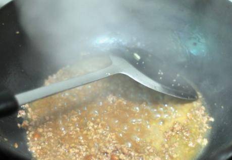 第三步,所有材料準備好後,開始做飯。鍋中加入適量食用油,燒熱,放入肉末,迅速攤開,炒至白色,放入薑、蒜;