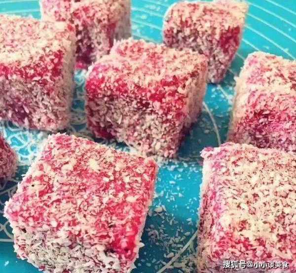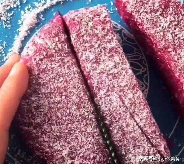 7.切開,再切成小塊,底部均勻鋪上椰絲。
