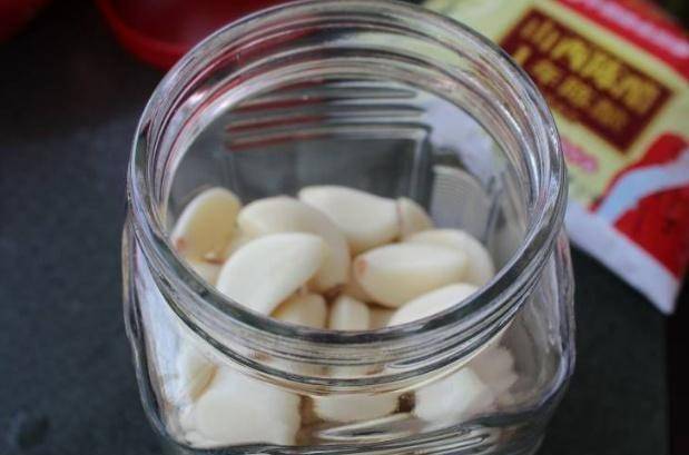第三步:所有材料處理好後,準備一個適合醃制一下大蒜的玻璃容器。清潔後,必須清潔玻璃容器。不能沾上水或油,容易滋生細菌和黴菌。準備好後,取出米醋倒入玻璃杯中,再加入幾粒白冰糖,讓大蒜的味道非常酸甜。