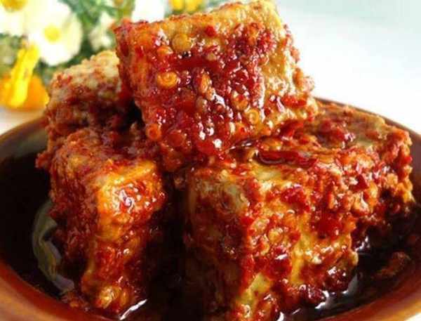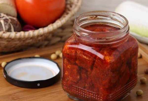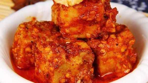 準備另一鍋熱油,將油加熱至開始冒煙,然後關火。關火後,把油放在一邊冷卻。然後將腐乳放入調料碗中,滾上辣椒粉,兩面包好,包好後輕輕撒上。然後把豆腐放在你放豆腐的瓶子或罐子裡。豆腐鋪好後,將冷卻的油倒入其中。油要超過豆腐,容器內不能有水分。最好用開水燙一下,然後晾幹。.大約醃制半個月或一個月後,即可食用。如果要加酒,可以加一點品質好的白酒。酒的香氣很濃。