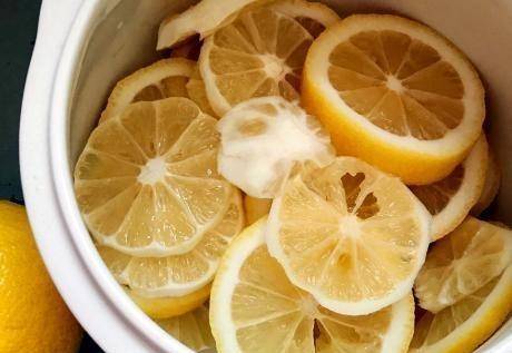 第二步,同時檸檬要用鹽搓幹凈,水要瀝幹。它也需要被切割。檸檬、米醋、冰糖等一起準備好,蘋果醋還有一個容器;