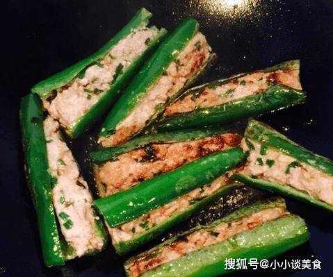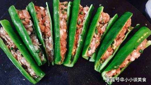 3、將醃制好的肉末塞入青椒中。你可以切掉青椒凸起的尾巴。