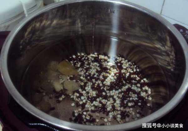 第三步:將紅豆和薏米泡好後,倒入鍋中,再往鍋中倒入清水。主廚在燉湯的時候選擇瞭高壓鍋,這樣可以把薏米和紅豆燉的更軟一些。加清水的時候也要註意量。水一定不能太多,容易影響口感。如果水太少,湯很容易煮熟。