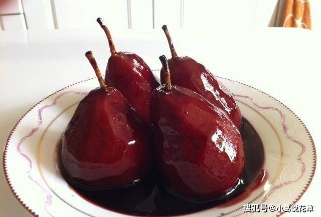 4.紅酒燒開,開蓋,放入去皮的梨子,轉小火慢燉20分鐘左右,煮的時候翻動一下,讓梨子瀝幹均勻,水開後撈出出鍋裝盤即可;