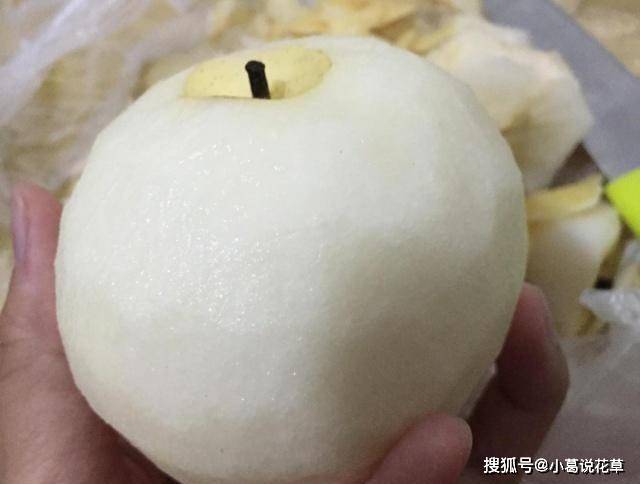 3、然後將雪梨去皮洗凈。不要取下燈泡的莖。煮熟後,可以用來切塊裝盤;