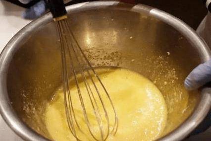 2、具體時間根據自己的情況而定。我用瞭大約5-7分鐘,佈丁變大到原來的5倍大,然後篩入準備好的低筋面粉。打發好的佈丁加入低筋面粉;