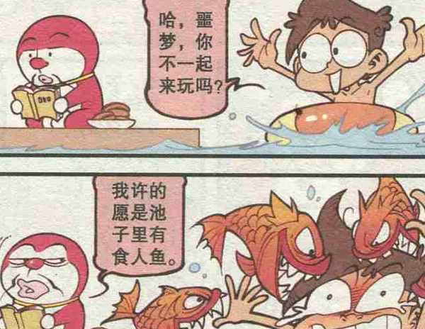 在許願麥克風的幫助下,星太奇真的能一個人享受著這整個游泳池了,但是有一點很奇怪的是,哆啦噩夢似乎不願意下來游泳,原來哆啦噩夢是通過許願麥克風,將食人魚移過來泳池裏,所以那些遊客因為害怕才趕緊跑掉的。在哆啦噩夢的"幫助"下,星太奇這次的游泳經歷估計會讓他很難忘吧。