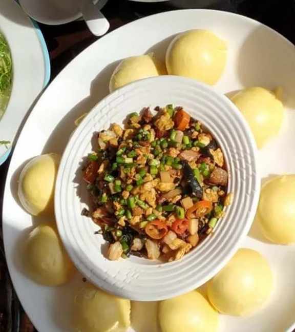 再就是窩窩頭包菜,是的,這個名字我自己起的,中間的菜就是蒜薹雞蛋肉沫啥的,外面一圈窩窩饅頭,放裡面吃,味道不錯。