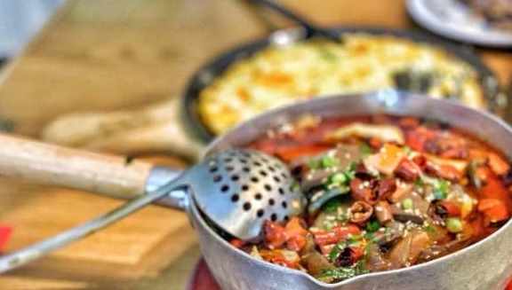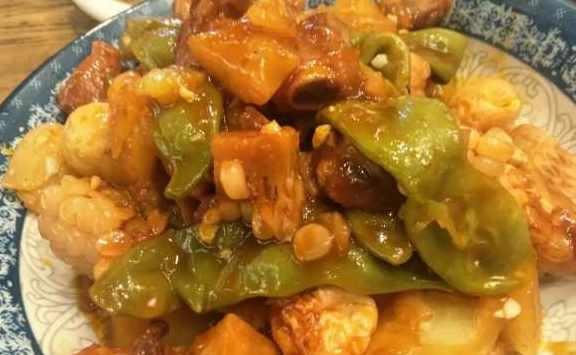 因為,牌子上寫的是,本店招牌菜:鍋包肉!所以,必須嘗嘗啊!想著東北菜量大,所以點了幾個菜。第一道是特色排骨,用肋排、玉米、扁豆以及虎皮鵪鶉蛋燴在一起的,