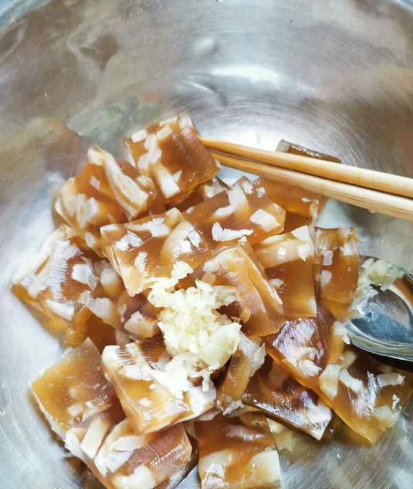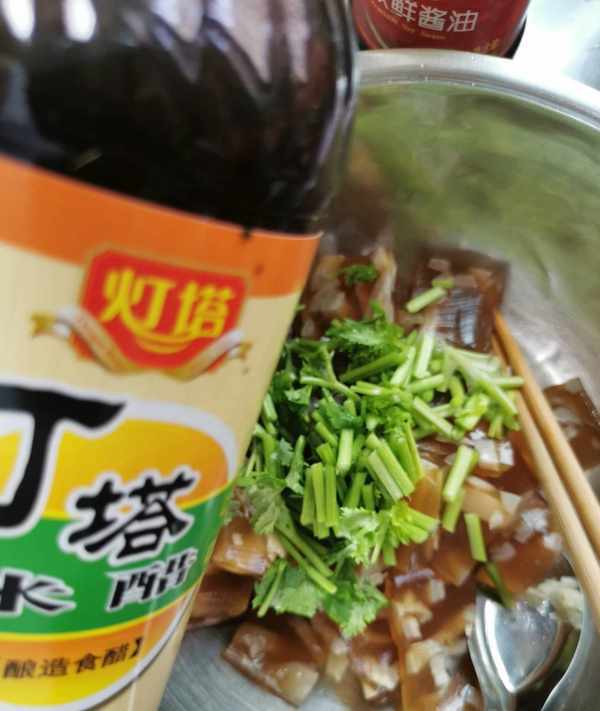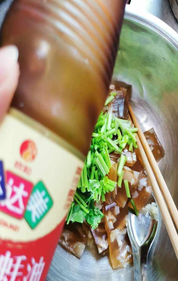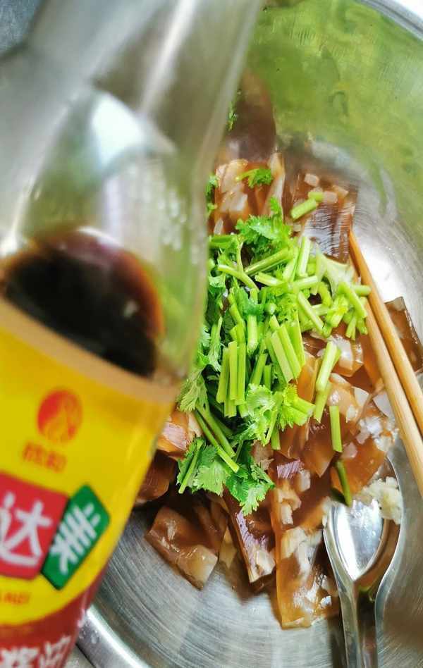 豬皮凍1塊、香菜適量、蒜泥適量、味極鮮醬油1勺、醋適量、蚝油適量