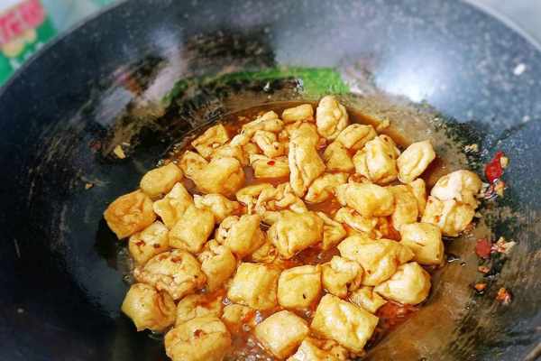 4、然後加入準備好的豆泡下鍋翻炒,讓豆泡均勻地裹上料汁,最後如果鍋中的湯汁太少的話,就再加入適量的水,蓋上蓋子,燜上五分鐘,讓豆泡成熟和入味,攪拌均勻就可以啦。
