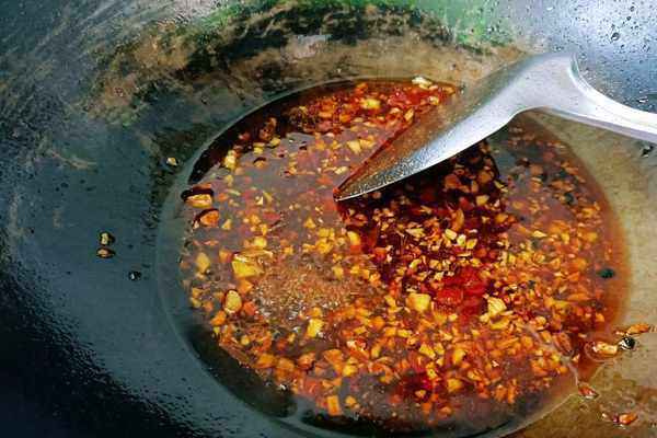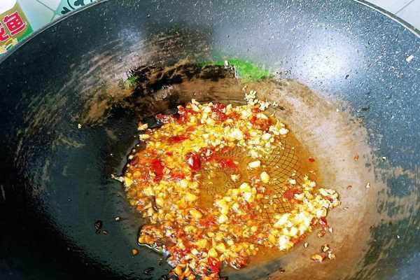 2、食材準備完全之後就可以開始烹飪啦,首先鍋中準備好適量的油,開中火把油溫升高到四成熱,加入準備好的蒜末下鍋爆炒,炒出香味,接著加入豆瓣醬一勺,翻炒出紅油,如果自己可以吃辣的話,還可以多準備一些幹辣椒,剪碎之後,炒出香味,增加辣味。