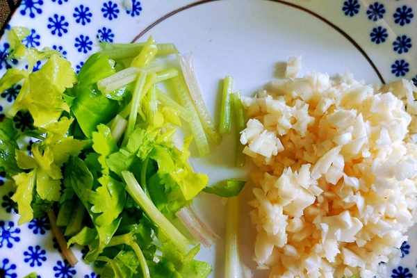 【所需食材】:芹菜兩根,香菜適量,大蒜幾瓣,生抽醬油,蠔油,胡椒幹辣椒,豆泡,鹽,味精,