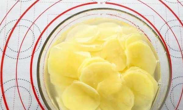 2、泡水多洗幾遍,將表面的淀粉洗掉不僅不會氧化變黑,還能夠防止一會兒炸薯片的時候互相粘到一起去