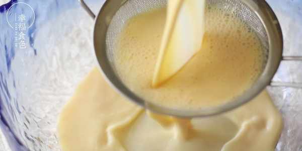 4、做好的佈丁液用濾網過篩兩遍,口感會更細膩,把蛋筋都過濾出來。
