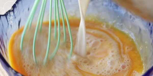 3、將牛奶慢慢倒入蛋液中,一邊倒一邊不停攪拌,使其充分混合均勻。
