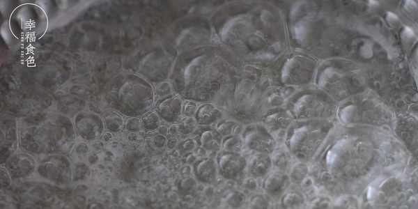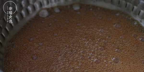 8、表面開始變成淺黃色,顏色進一步加深,直到呈現這種褐色的時候,倒入25克熱水,小火煮開即可,稍微冷卻後泡泡就會消失。