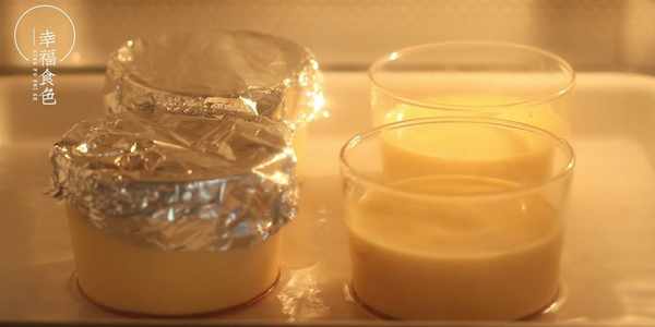 10、再倒入佈丁液放在烤盤中,加入適量熱水,想要口感更嫩,可以蓋一層錫紙。
