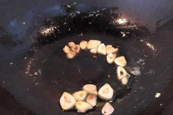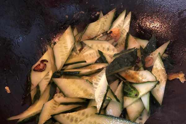 炒出蒜香,倒入一點點醬油,倒入切好的黃瓜片大火翻炒。