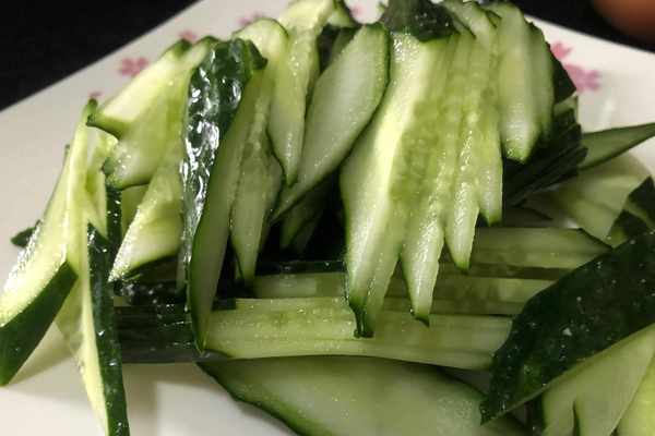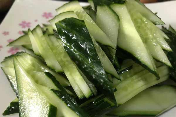 首先,將黃瓜切成菱形片,目的隻覺得好看。