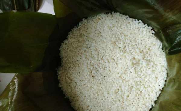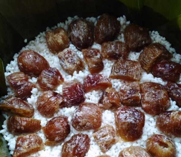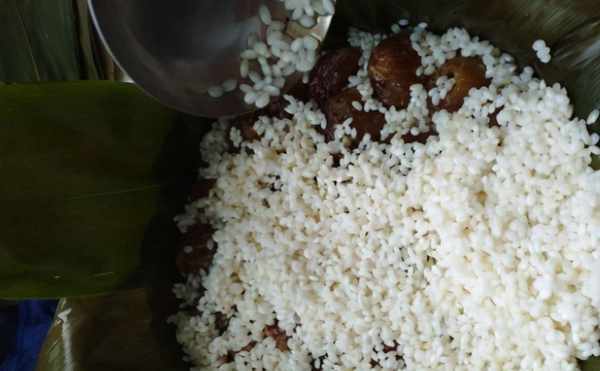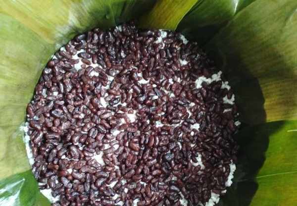 這簡易粽子蛋糕怎麼做呢?來!用蛋糕模具擺上粽葉鋪滿提前泡好的糯米,一層米一次棗,一層米一層煮好的甜紅豆一層米蓋好,把粽葉蓋上壓實,放高壓鍋煮就行,要壓結實瞭,要不一膨脹就隻有喝粥的份瞭!