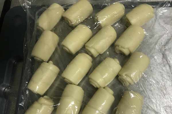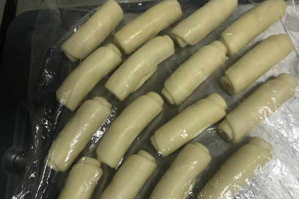 17、依次將所有的面卷都分別搟長卷起,用保鮮膜蓋好,如圖所示。