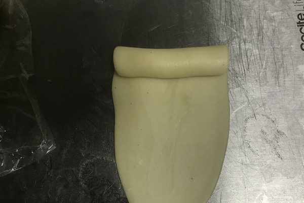 14、按照操作順序,從第一個包好的面團,用搟面杖將其搟成長條,自一端向另一端卷起來,如圖所示。