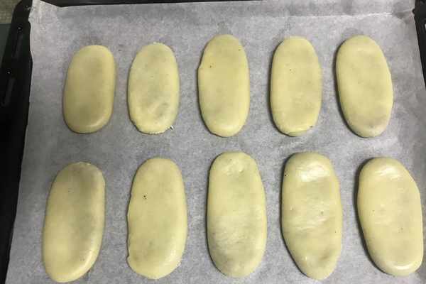 20、依次將其它面團分別都包好餡料,整理成長條,依次擺放到烤盤中,如圖所示。