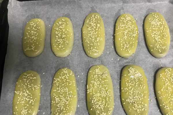 21、表面刷上一層蛋液,再撒上適量芝麻按壓一下,如圖所示。