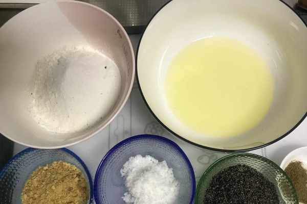 餡料部分:普通面粉50克、糯米粉50克、熟芝麻30克、熟花生碎30克、玉米油65克、花椒粉2克、鹽3克