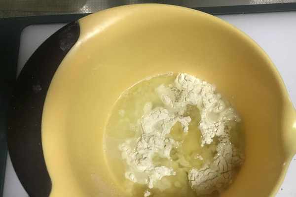 7、接下來,再制作一下油酥面團部分:同樣很簡單,隻需將油酥面團所需的食材混合在一起即可,如圖所示。