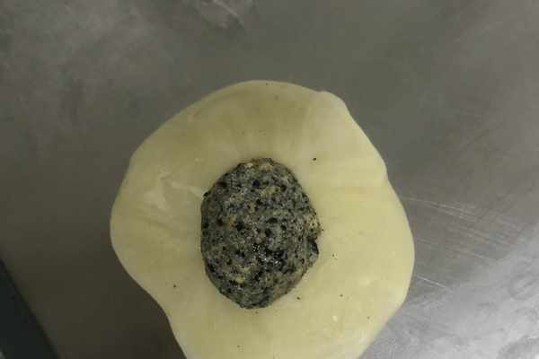 18、同樣還是按照操作順序,將其兩端向中間對攏,按壓扁,用搟面杖搟成圓形薄片,放入前面我們分好的餡料,如圖所示。
