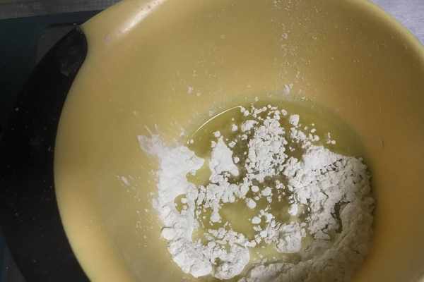 5、開始制作水油皮面團部分:隻需將水油皮部分所需的食材全部混合在一起即可,如圖所示。